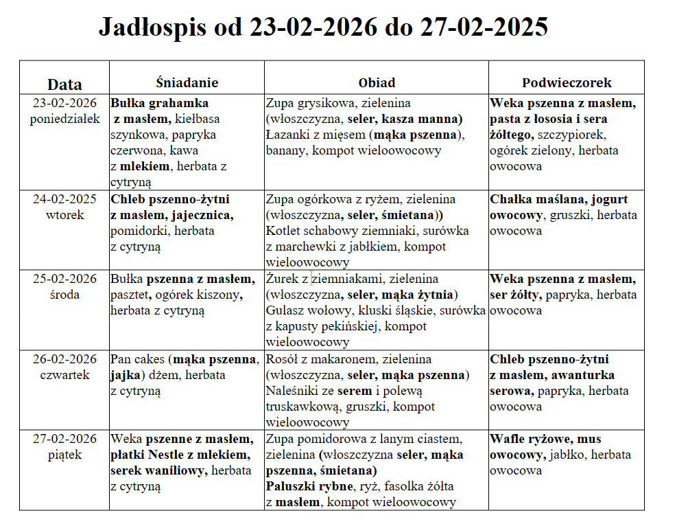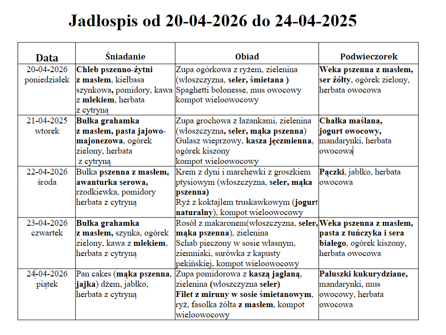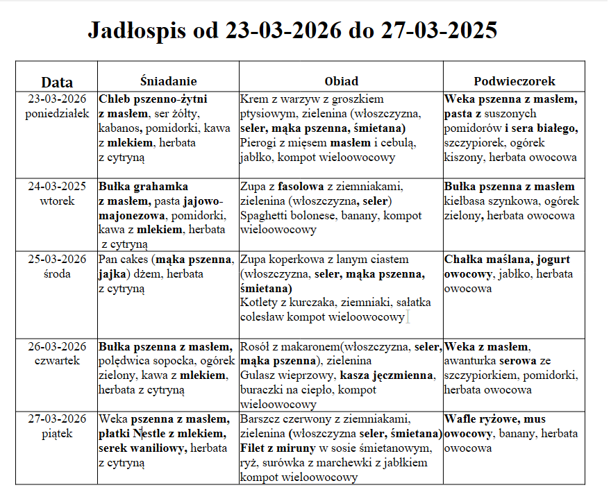 W niniejszym jadłospisie wyróżniono substancje lub produkty powodujące alergie lub reakcje nietolerancji zgodnie z załącznikiem II do Rozporządzenia Parlamentu Europejskiego i Rady (UE) nr 1169/2011 z dnia 25 października 2011 r.